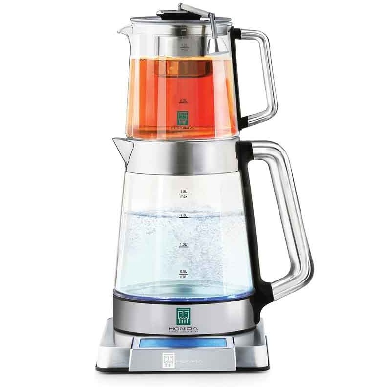 در میانه جذابیتهای آشپزخانه، چایساز هونیرا مدل TMD-100 با بدنهای از شیشه شفاف و پایه استیل یکپارچه، جلوهای زیبا و مدرن را در کنار کارایی بالا به ارمغان میآورد. این دستگاه با ظرفیت کتری 2 لیتر و قوری 1.5 لیتری، امکان تهیه حجم مناسبی از چای را فراهم کرده و توری فیلتر با تراکم بالا، نوشیدنیتان را عاری از رسوبات نگه میدارد. توان مصرفی 2500 وات در کنار وزن قابلتحمل 3100 گرم و سیم به طول یک متر، کاربری آسان و کمجا بودن را تضمین میکند. طراحی رویهمنصب قوری روی کتری و کف استیل ضدزنگ، دوام بالا و تجربه یک چایساز مطمئن را ارائه میدهد.