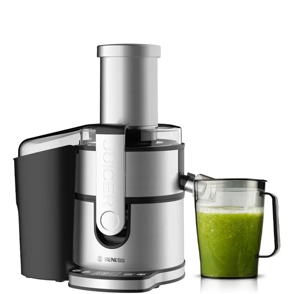 در نگاه اول طراحی مینیمال و ارگونومیک دستگاه جلب توجه میکند؛ بدنه تمام استیل ضدزنگ با ابعاد جمعوجور (۴۵۰×۲۳۰×۴۰۰ میلیمتر) دوام بالا را تضمین میکند و دهانه ورودی ۸۵ میلیمتری امکان استفاده از میوههای درشت را فراهم میآورد. موتور ۸۰۰ واتی دستگاه با پنج سطح سرعت متغیر، با دقت و قدرت مناسب انواع میوههای نرم تا سخت را پرس میکند و تیغههای استیل ضدزنگ کیفیت عصارهگیری را بالا میبرند. ظرفیت مخزن آبمیوه ۱۱۰۰ میلیلیتر و مخزن تفاله ۲۰۰۰ میلیلیتر این امکان را میدهد که در یک بار کارِ آزمایش، حجم قابل توجهی نوشیدنی تهیه کنید. میکروسوییچ ایمنی بنس مدل BJ-P362G از راهاندازی ناخواسته جلوگیری کرده و استانداردهای کیفی برند ایرانی بنس را به نمایش میگذارد.