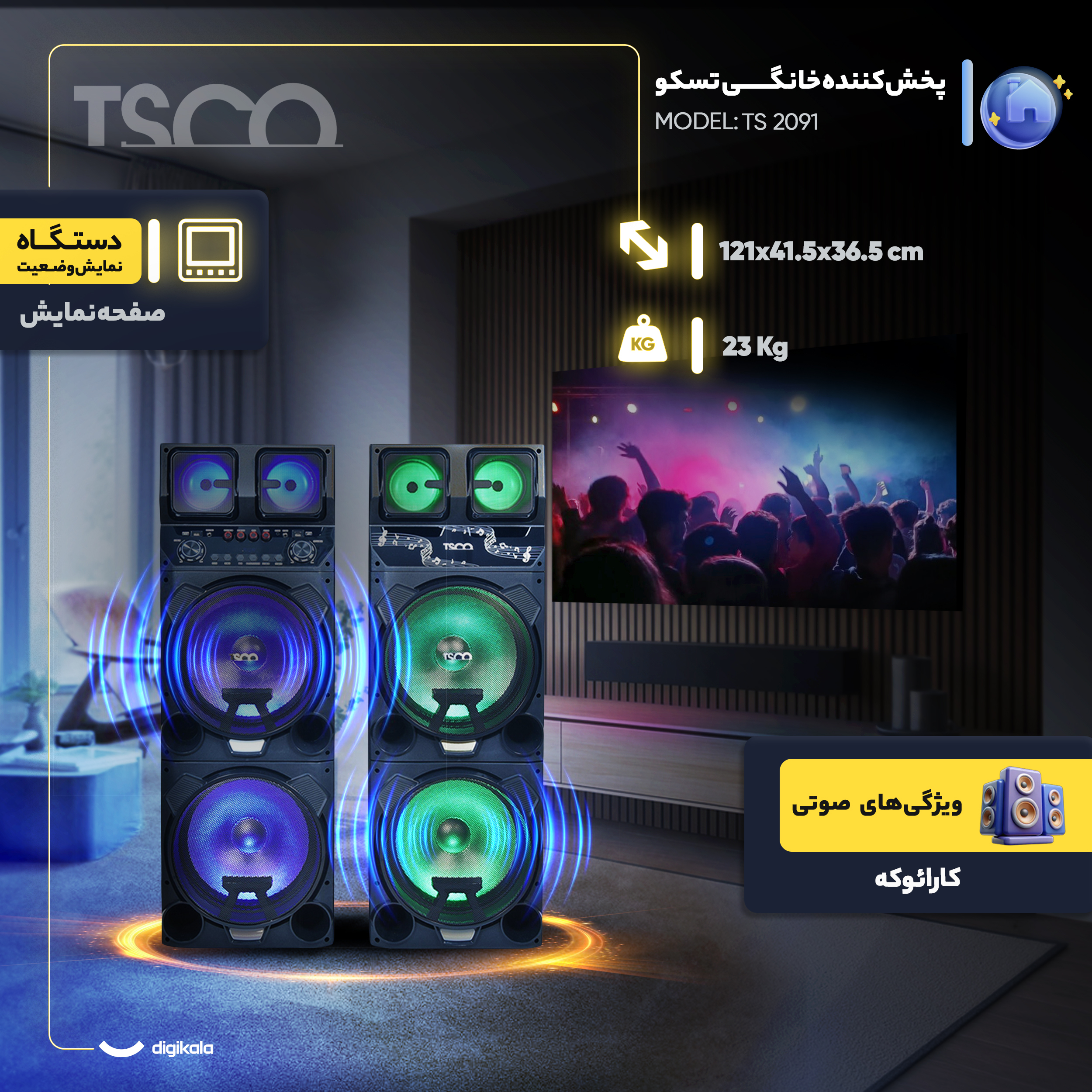 در قلب طراحی دقیق و مستحکم این سیستم صوتی ایستاده، ترکیب چوب و پلاستیک کیفیت ساخت بالایی را نوید میدهد و با ابعاد ۱۲۱×۴۱.۵×۳۶.۵ و وزن ۲۳ کیلوگرم، حضور قدرتمندی در فضا ایجاد میکند. توان ۲۰۰ وات در کنار چهار سابووفر ۱۵ اینچی بیس عمیق و صدای کوبندهای ارائه میدهد و رقص نور RGB جلوهای بصری را همراه با صفحه نمایش دیجیتال به تجربه صوتی میافزاید. امکانات پخش متنوع شامل USB، شیار SD، AUX و ورودیهای اپتیکال و کواکسیال ارتباطی انعطافپذیر با دستگاههای گوناگون فراهم کرده و بلوتوث ۴.۲ اتصال بیسیم مطمئنی را تضمین میکند. قابلیت TWS برای ایجاد صدای استریو گسترده، ورودی میکروفون و گیتار همراه تنظیم ولوم و گزینه کارائوکه، این مدل را به انتخابی کامل برای مهمانیها و مصارف خانگی تبدیل میکند.
