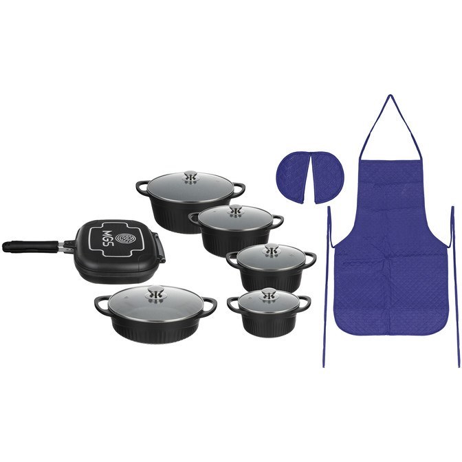 شامل تابه دو طرفه سایز 30 (49×8×33 سانتیمتر، 1850 گرم)، قابلمه سایز 28 (37×13×29 سانتیمتر، 1850 گرم)، قابلمه سایز 24 (33×12×25 سانتیمتر، 1505 گرم)، قابلمه سایز 20 (28×10×21 سانتیمتر، 1070 گرم)، تابه دو دسته سایز 28 (37×8×29 سانتیمتر، 1715 گرم)، قابلمه سایز 32 (42×14×32 سانتیمتر، 2295 گرم)، یک عدد پیشبند و دو عدد دستگیره، دارای محفظه خروج بخار هوا و رینگ استیل، کفی پخش حرارت، مناسب برای انواع اجاق گاز
